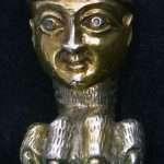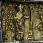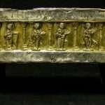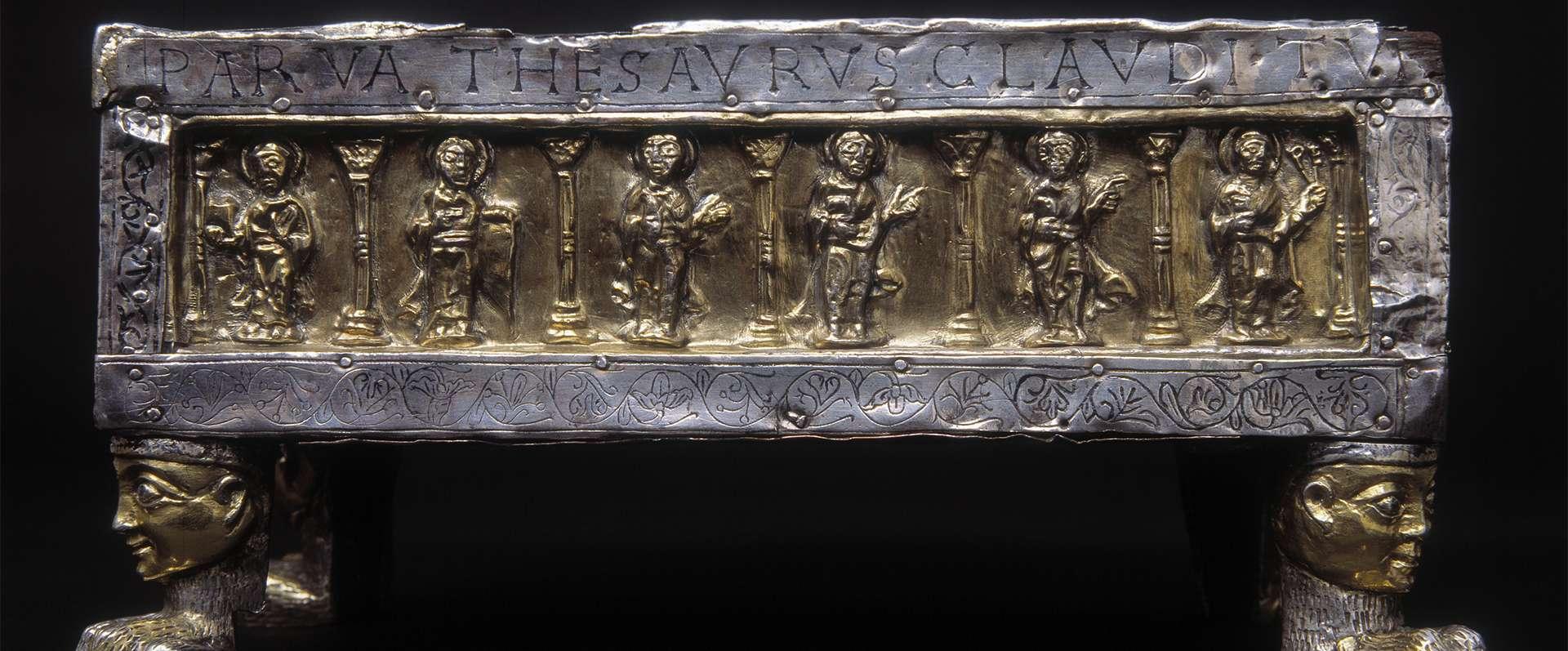 Sul registro inferiore si trova un’altra lamina d’argento come quella superiore. Sulla faccia inferiore della cassetta è inchiodata una lamina di rame inciso e dorato. Ai quattro angoli della faccia inferiore si trovano inchiodati con chiodi di ferro molto grandi quattro piedi di argento fuso, parzialmente dorato, niellato e cesellato raffiguranti protromi maschili sostenuti da una zampa di felino.