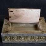 All’interno la cassetta è cava e sulla faccia inferiore si apre uno sportellino chiuso da una serratura, a fianco dello sportellino è scavata una sede per la chiave che tuttavia è mancante. La serratura è di ferro, come anche i cardini dello sportellino.