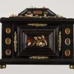 La coppia di cofanetti appartiene ad una raffinata tipologia di oggetti d’arredo polimaterici, commissionati per custodire le gioie di facoltose gentildonne. Benché i due scrigni presentino talune differenze, entrambi sono costituiti da una scatola a forma di parallelepipedo, rialzata su quattro piedini decorati, e da un coperchio che si sviluppa secondo una piramide a gradoni. All’interno del blocco inferiore si trova un ampio vano, rivestito in tessuto e carta, ideale per deporvi monili e piccole suppellettili e provvisto di meccanismo di serratura di cui si conserva ancora la chiave; sollevando il coperchio, l’anta inferiore mostra uno specchio ivi applicato. Sul lato opposto del coperchio, si può notare un ulteriore scomparto richiudibile ricavato nel gradone superiore, ove si apre uno sportelletto ribaltabile mostrando un altro piccolo specchio sul lato interno dell’anta.
