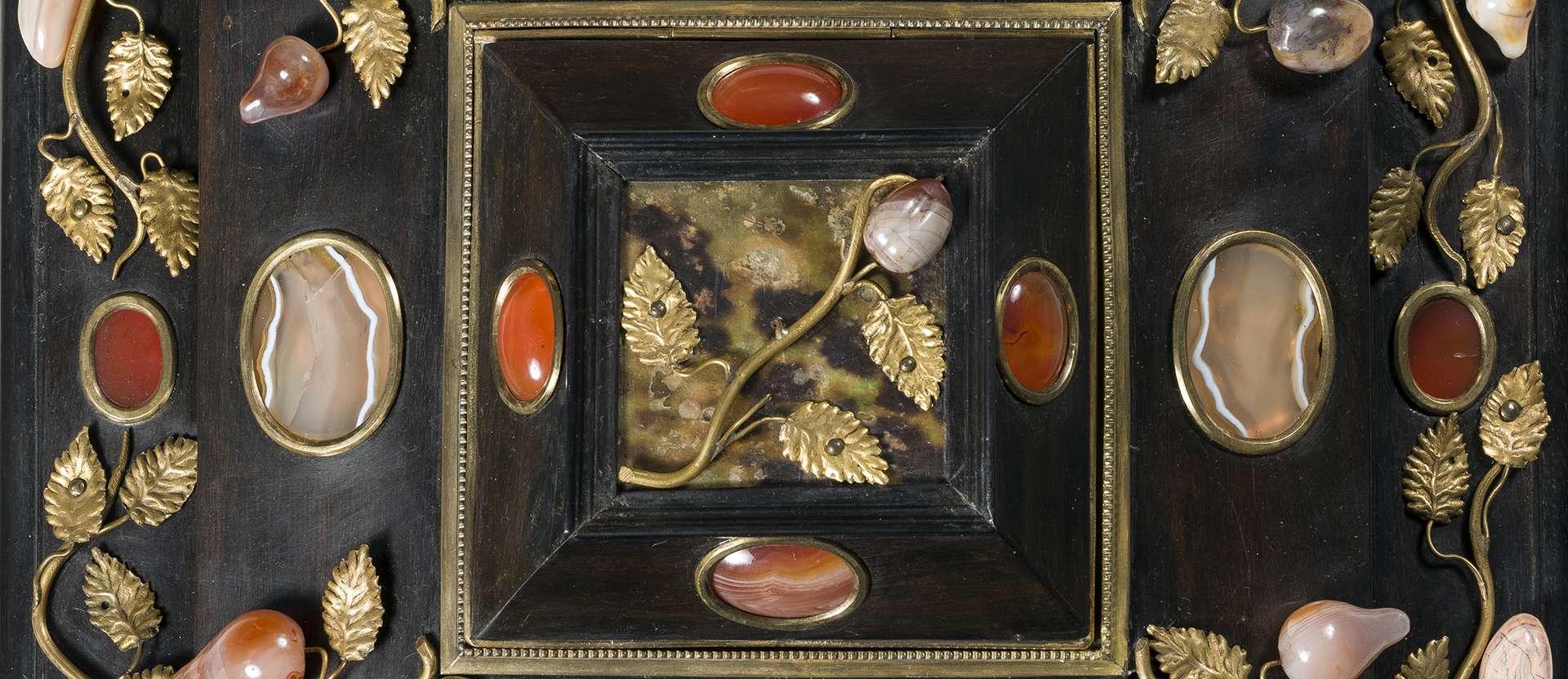 La struttura di entrambi i cofanetti è in legno, con impiallacciatura in essenza di pero patinato per simulare l’aspetto dell’ebano ed alcune semplici cornici intagliate in ebano; al centro di ciascun prospetto sono applicati dei riquadri in tartaruga, sormontati da racemi in bronzo dorato da cui affiorano fruttini in pietra dura; le restanti superfici sono impreziosite da altri rametti e da gemme incastonate.