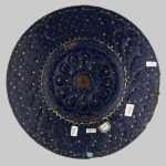 Questa tipica manifattura veneziana si avvale della tecnica dello smalto dipinto su rame, in colore bianco opaco sul blu, con foglia d’oro. Attraverso l’osservazione al microscopio, è stata accertata la presenza di un primo strato di smalto opaco, di colore rosso, a diretto contatto con il metallo. Sopra di esso è stato poi steso un successivo strato di smalto bianco opaco, coperto poi parzialmente con smalto traslucido blu, risparmiando le zone d’aggetto corrispondenti alle baccellature centrali. Il colore blu è stato inoltre steso, sul fronte, in corrispondenza del bordo, nelle baccellature prossime al bordo e nello stemma sul cavetto. La sponda è invece decorata con uno smalto verde. L’operazione successiva alla smaltatura con lo smalto traslucido è stata probabilmente l’applicazione della foglia d’oro, la cui tecnica tradizionale riportata nei ricettari e manuali ottocenteschi, prevede l’adesione della foglia sullo smalto già cotto, tramite adesivi organici (gomma adragante, riferita ai manuali moderni, gomma arabica oppure essenza di lavanda e trementina), seguita da ricottura.